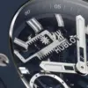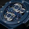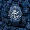 Diameter : 45 mm. Thickness : 15.95 mm. Water resistant to 100 meters. Microblasted and polished blue ceramic Sapphire crystal with anti-reflective treatment. Titanium screws. Blue ceramic and sapphire crystal case back.Bezel : Microblasted and polished blue ceramic. Black composite resin lower bezel. 6 H-shaped titanium screws.Dial : Matte blue skeleton. Movement : Straps and clasp : |