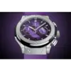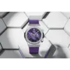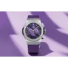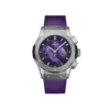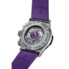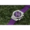 The purple sunray dial stands out with silver-tone chronograph counters, applied indices, and luminous hands for superior legibility. Its 42mm satin-finished titanium case is paired with a black rubber strap lined with purple, ensuring comfort, durability, and bold aesthetics.