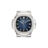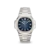 Its sunburst blue dial, fading subtly to black at the edges, features horizontal embossing and applied white gold hour markers with luminescent coating — a classic, unmistakable Nautilus look. A date window at 3 o’clock adds balanced functionality.