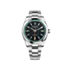 This reference features a 40mm Oyster case in robust 904L Oystersteel, paired with a solid-link Oyster bracelet for durability and comfort. Its defining feature is the exclusive green sapphire crystal (GV – Glace Verte), unique to the Milgauss line, which gives the watch its unmistakable identity.