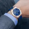 The deep blue sunburst dial showcases superb clarity, with refined subdials displaying the day, date, month, and leap year. The pink gold markers and hands glow subtly with luminescent coating, enhancing readability and adding a modern touch to its classic elegance.